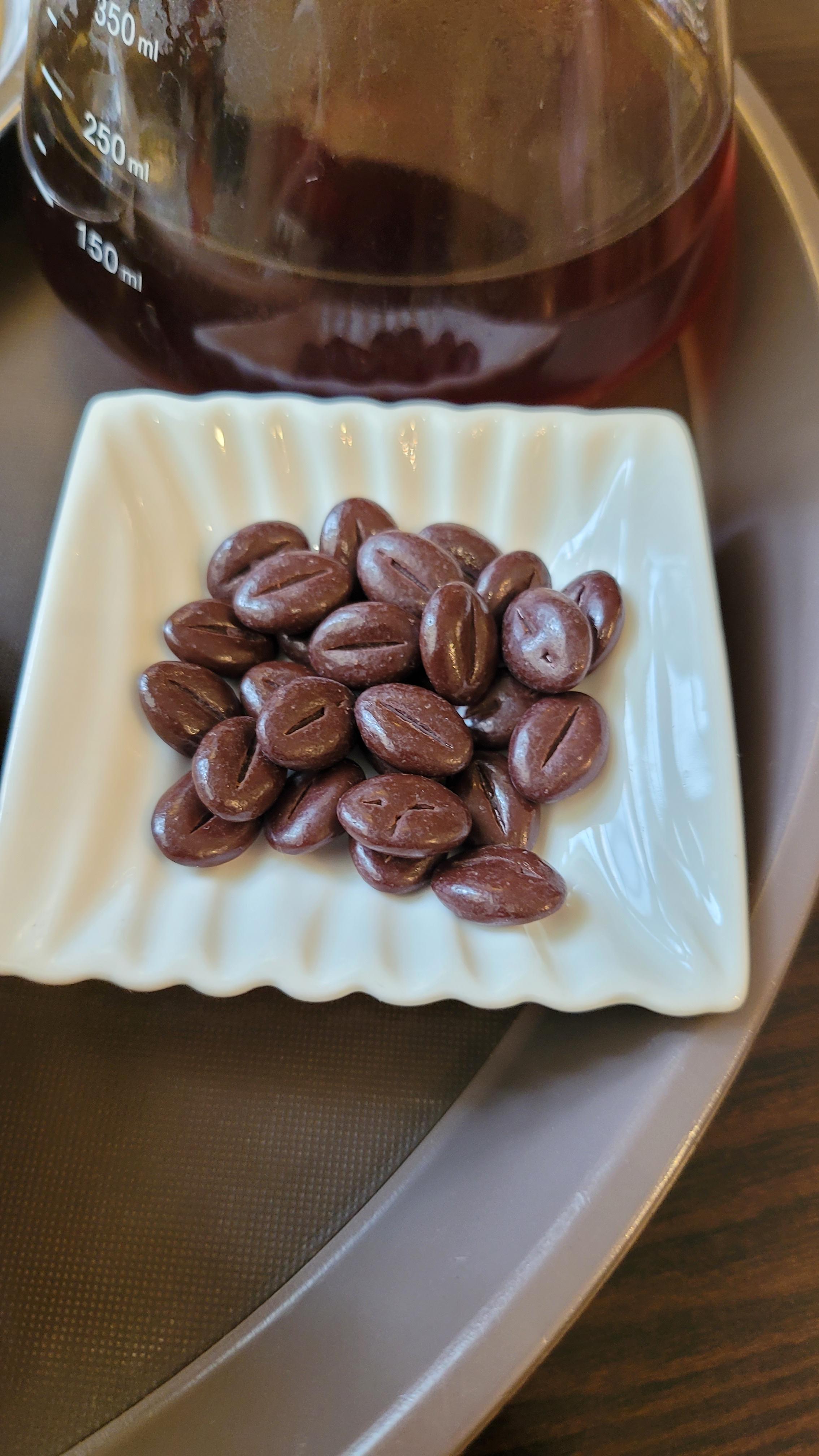 서비스로 나오는 커피콩모양 초콜릿이 커피와 또 어울리는 조합으로 훌륭했습니다!